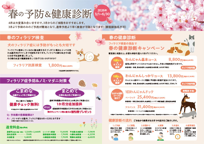 〇予防の種類:フィラリア症予防、春の健康診断、混合ワクチン予防接種、狂犬病予防接種